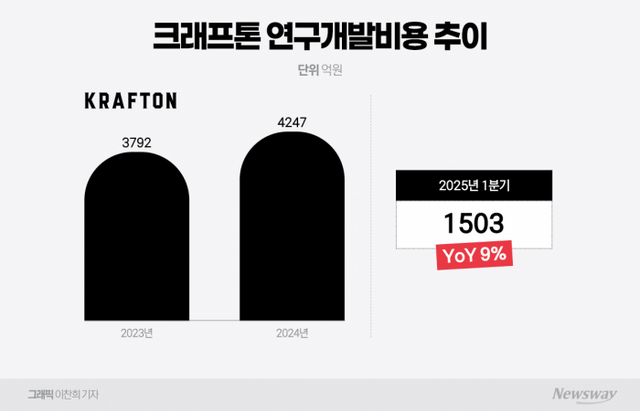 29일 업계에 따르면, 크래프톤은 지난 1분기 연구개발에 전년 동기(1371억원) 대비 9% 정도 늘어난 1503억원을 썼다. 이는 1분기 전체 매출(8742억원)의 17.2%에 달한다.