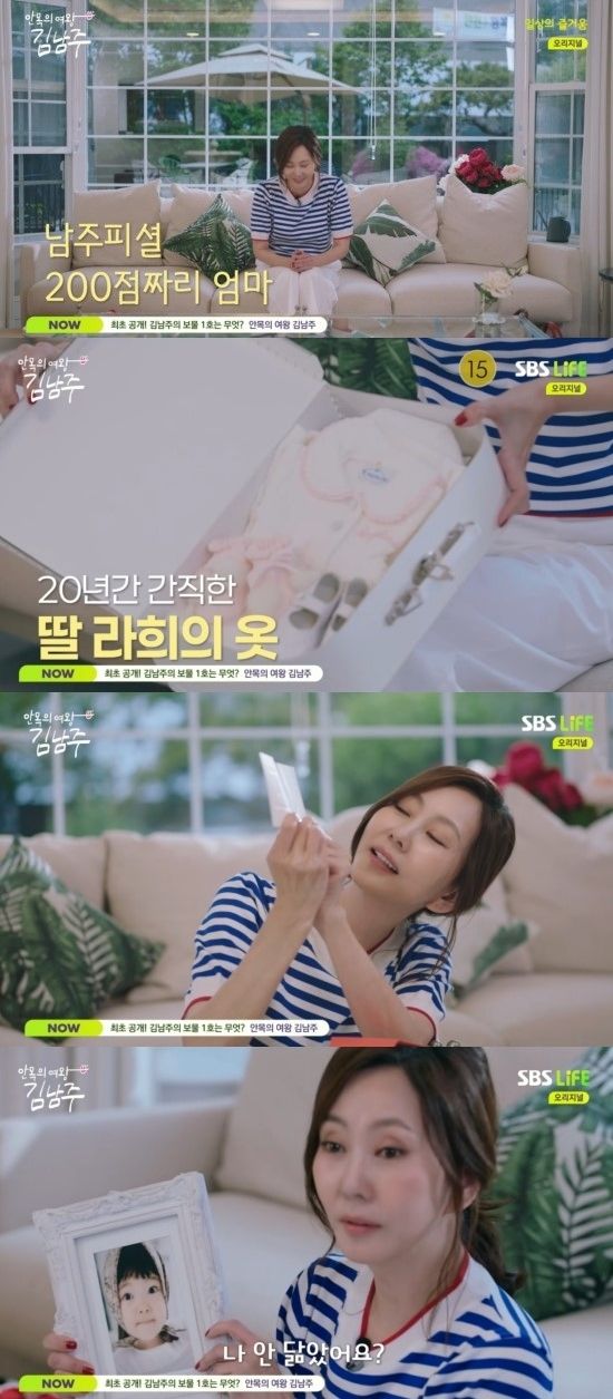 그러더니 김남주는 "배우보다는 엄마로서의 삶이 참 행복했다"며 눈물을 글썽여 눈길을 끌었다. 가장 소중한 보물로 20년간 소중히 간직한 딸의 배냇저고리와 처음 입었던 옷, 첫 이불을 꺼낸 김남주는 "가금 보물상자를 열어 본다"면서 20살이 된 딸에 대해 "지금은 나보다 더 커졌다. 오히려 나를 귀여워한다"라는 근황을 전하기도 했다.