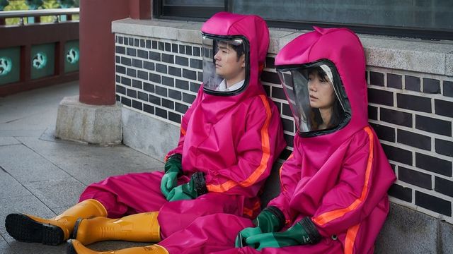 영화에서 강한 인상을 남기는 요소 중 하나는 바로 핑크색 보호복이다. 전염병을 다룬 기존 작품에서는 보기 드문 강렬한 핑크색은 ‘바이러스’만의 독특하고 사랑스러운 분위기를 완성하는 데 큰 역할을 한다. 촬영 준비 과정에서 제작진은 보호복의 색상을 두고 여러 차례 논의와 테스트를 진행했는데, 너무 현실적인 색상을 선택하면 공포감을 줄 수 있고, 반대로 판타지적인 색을 택하면 관객의 몰입도가 떨어질 우려가 있었다. 하지만 결국 보호복의 핑크색 덕분에 영화 전체의 톤이 잘 맞아떨어졌다는 평가를 받았다.