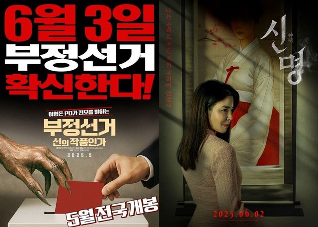 이외에도 6월 2일 오컬트 정치 영화 ‘신명’이 개봉한다. ‘신명’은 신비로운 힘을 이용해 권력을 쥐려는 한 여인과, 숨겨진 진실을 파헤치는 기자의 치열한 싸움을 담았다. 예고편이 공개된 후 온라인상에서는 김규리가 맡은 캐릭터 윤지희가 윤석열 전 대통령의 배우자 김건희를 연상시킨다며 화제를 모으기도 했다.