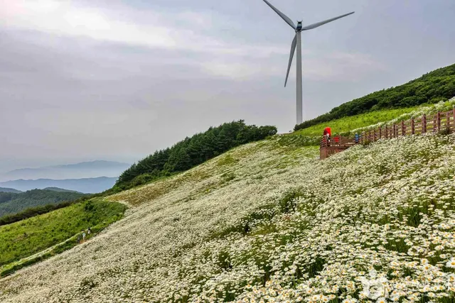 6월 초순부터 중순까지는 샤스타데이지가 절정에 달합니다. 이때 청명한 하늘과 순백의 꽃이 어우러지며 평창의 아름다움을 극대화합니다.