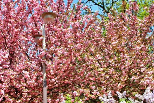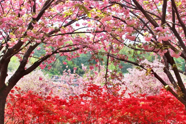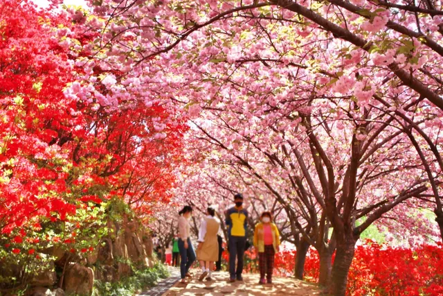 겹벚꽃나무뿐만 아니라 빨갛게 물드는 철쭉도 있어 다채로운 풍경을 감상할 수 있습니다. 주변의 벤치와 쉼터에서 잠시 쉬며 전주의 봄바람을 즐기는 것도 좋습니다. 초록 잎과 겹벚꽃의 조화는 봄의 특별한 풍경을 연출합니다.