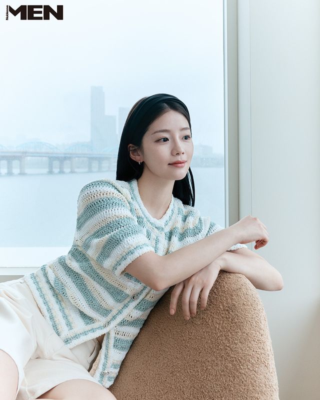 은은한 반짝임의 니트 크로셰 카디건과 화이트 데님 쇼츠 모두 Mine, 이어링 스타일리스트 소장품.