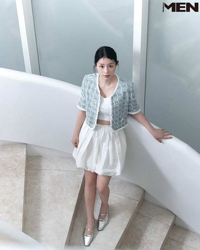 리본 디테일과 브레이드 트리밍이 조화로운 트위드 크롭트 재킷, 화이트 슬리브리스 톱, 볼륨 있는 실루엣의 리넨 쇼츠, 실버 슬링백 모두 Mine, 링 스타일리스트 소장품.
