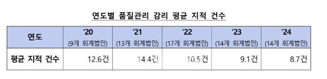 상장회사 감사인 등록제가 도입된 2020년 이후 품질관리 감리 지적 건수는 꾸준히 감소하는 추세다. 2020년 9개 회계법인 평균 12.6건, 2021년 13개 법인 14.4건, 2022년 17개 법인 10.5건, 2023년 14개 법인 9.1건, 2024년 14개 법인 8.7건으로 집계됐다. 금융당국은 “감사품질 개선의 긍정적 신호로 볼 수 있다”고 평가했다. 다만 여전히 일부 미흡사항이 발생하고 있어 회계법인의 적극적인 개선 노력이 필요하다고 강조했다.