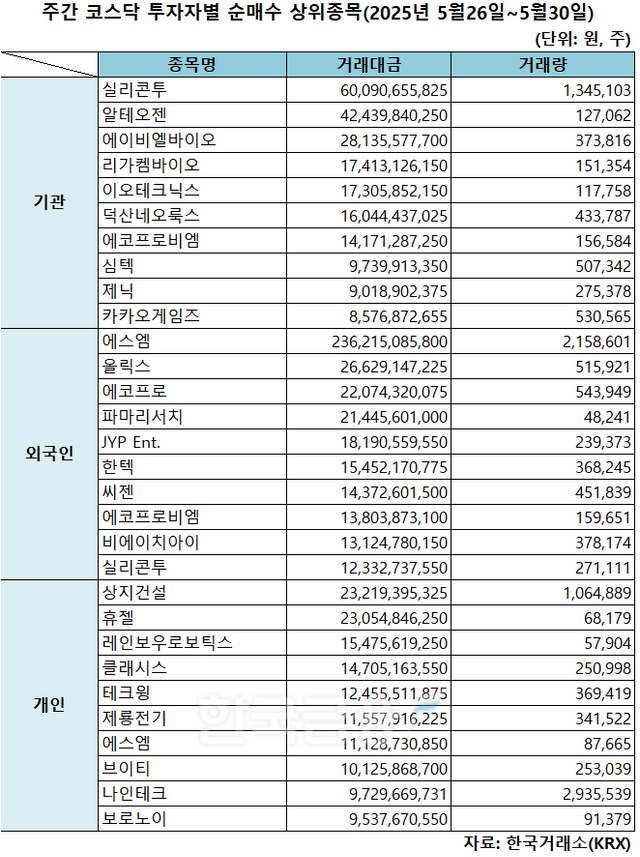 기관 '실리콘투'·외인 '에스엠'·개인 '상지건설' 1위 [주간 코스닥 순매수- 2025년 5월26일~5월30일]