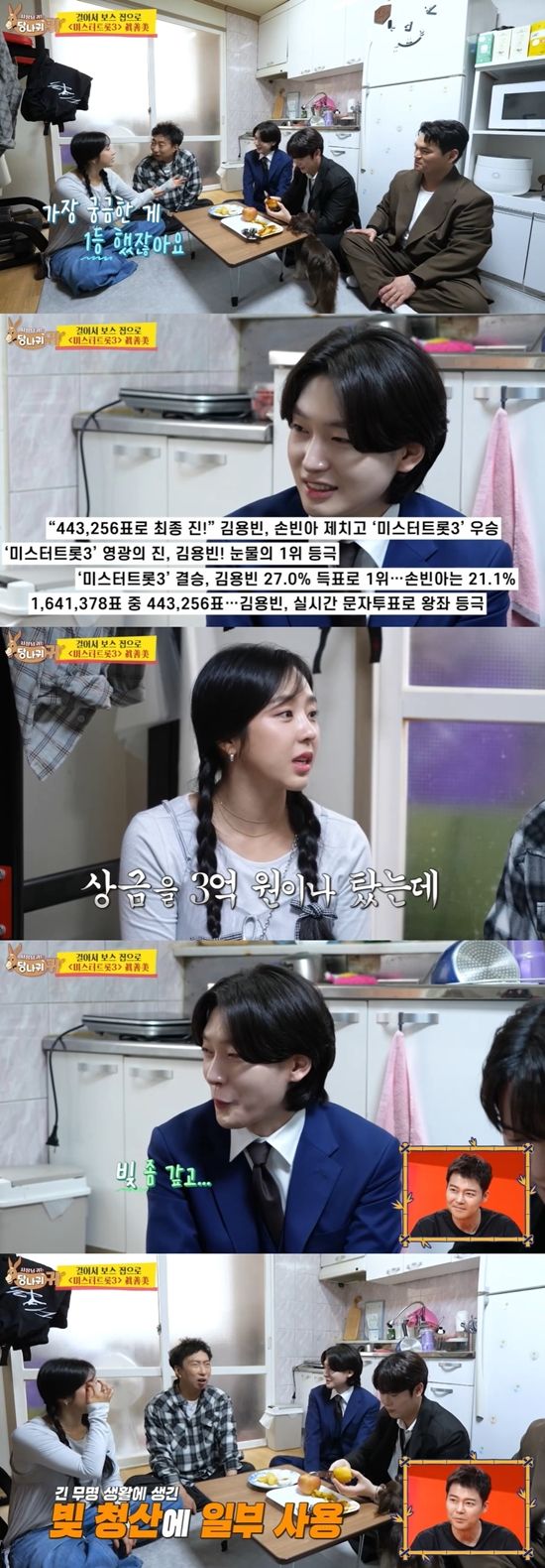 김예원은 "제일 궁금한 게 1등 하셨다. 상금을 3억이나 탔는데, 상금의 행방은 어떻게 됐나"고 질문했다. 김용빈은 "빚 갚았다. 돈 쓸 시간이 없다. 찾아주시는 분들이 많다. 행사를 많이 가서 기쁘다. 얼마 전에 화장품 광고를 처음으로 찍었다"며 달라진 근황을 밝혔다.