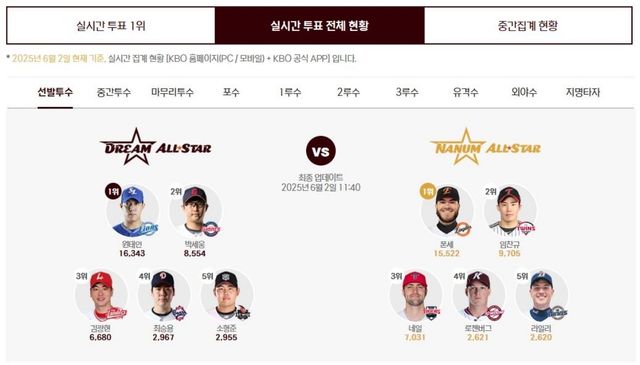6월 2일 오전 11시 40분 기준으로 실시간 선발투수 1위는 1만 6343표를 얻은 드림팀의 원태인(삼성)과 1만 5522표를 얻은 나눔팀의 폰세(한화)가 이름을 올렸다. 각 팀 포지션별 1위는 KBO 홈페이지에서 확인할 수 있다.