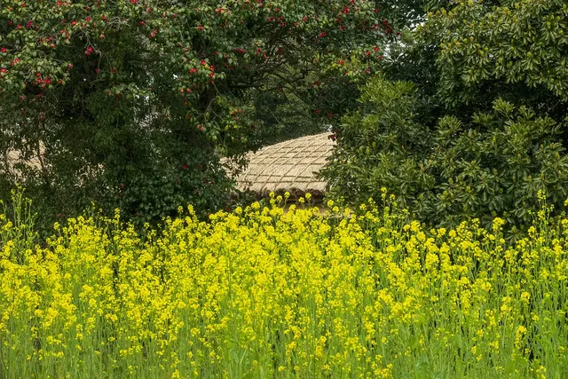 제주 민속촌에서는 전통 초가집과 유채꽃이 함께 어우러져 제주 전통과 봄의 아름다움을 모두 느낄 수 있습니다. 한복 체험과 전통문화 체험을 하며 유채꽃을 감상할 수 있어 다양한 즐거움을 제공합니다.