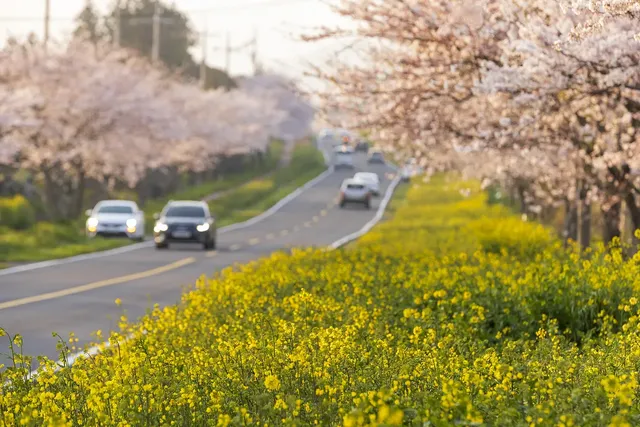 가시리 녹산로는 제주 최고의 드라이브 코스로, 양옆의 유채꽃이 매력적입니다. 차창을 여는 것만으로도 봄의 분위기를 만끽할 수 있는 장소입니다. 잠시 차를 세우고 사진을 남기면 기억에 더욱 오래 남습니다.