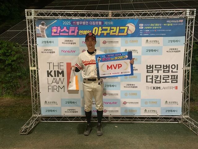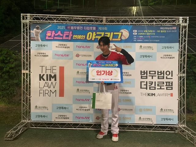 뮤지컬배우 인터미션 김승회가 지난 2일 고양 장항야구장에서 열린 더킴로펌배 제19회 한스타 연예인 야구리그, BMB와 경기서 7이닝 완투승을 거두며 MVP를 수상했다. 김승회는 연예인 야구 최초 '3경기 연속 완투승' 기록을 세웠다. / 한스타미디어 제