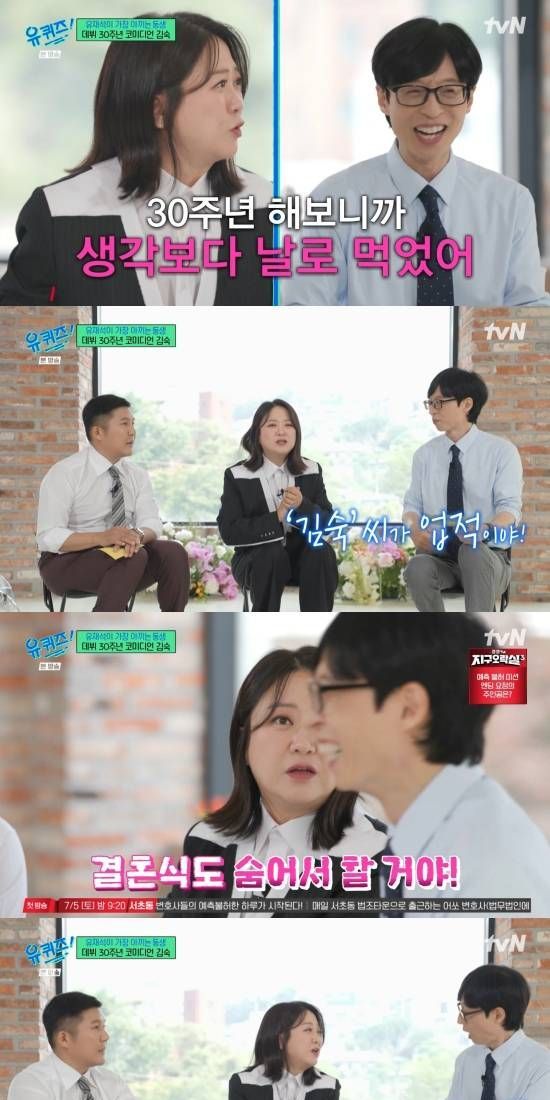 4일 방송된 tvN 유 퀴즈 온 더 블럭'(유퀴즈)에서는 1995년 21세에 '대학개그제' 은상으로 데뷔해 30주년을 맞은 김숙이 게스트로 출연한 장면이 전파를 탔다.