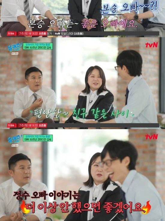 조세호는 "정수 형 얘기 나오면 누나가 '아이씨'가 나온다면 구본승 씨 얘기하면 안 그런다"라며 윤정수와는 다른 기류를 짚었다.