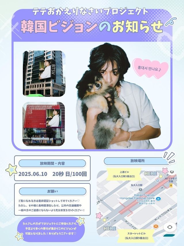 한국에서는 서울 홍대입구역 인근 대형 전광판 두 곳에서 뷔의 전역을 축하하는 영상이 상영될 예정이다. 먼저 2번 출구에 위치한 빌딩의 전광판은 가로 16m, 세로 14m의 대형 규모로, 유동 인구가 많은 도로 코너에 자리하고 있어 가시성과 접근성이 뛰어나다.