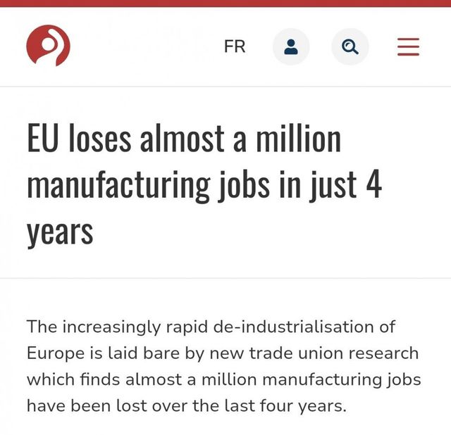 최근 4년간 독일 및 유럽에서 제조업 일자리 약 100만개가 날라갔고 중국이 고부가가치 제조업까지 다 잡아먹으려 공세하면서 위협 사정권에 있는 일자리는 약 3000만개로 유럽 일자리 4분의 1.