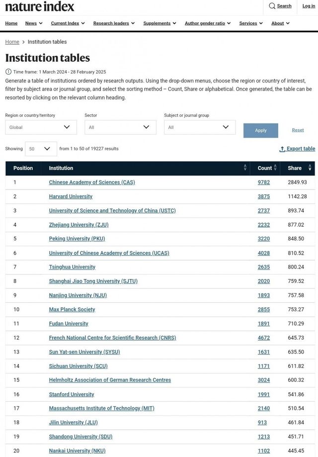 네이처지 연구 기관 최상위 10위권에 중국 연구 기관이 8개, 20위권으로 넓히면 14개 ]