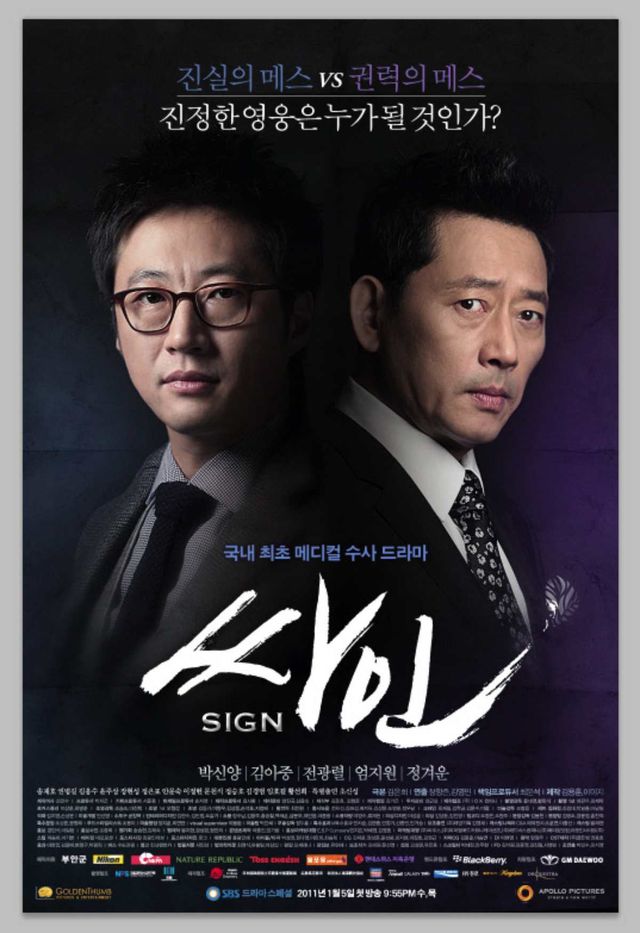 '싸인'은 2011년 1월부터 3월까지 총 20부작으로 방송됐으며, 장항준·김형식이 연출을 맡고, 김은희·장항준이 공동 집필을 맡았다. 극 중에서는 박신양과 김아중 외에도 전광렬, 엄지원, 정겨운 등이 주요 배역으로 출연해 극의 무게감을 더했다. 특히 전광렬은 권력과 결탁한 국과수 원장 역을 맡아 강한 존재감을 드러냈다.
