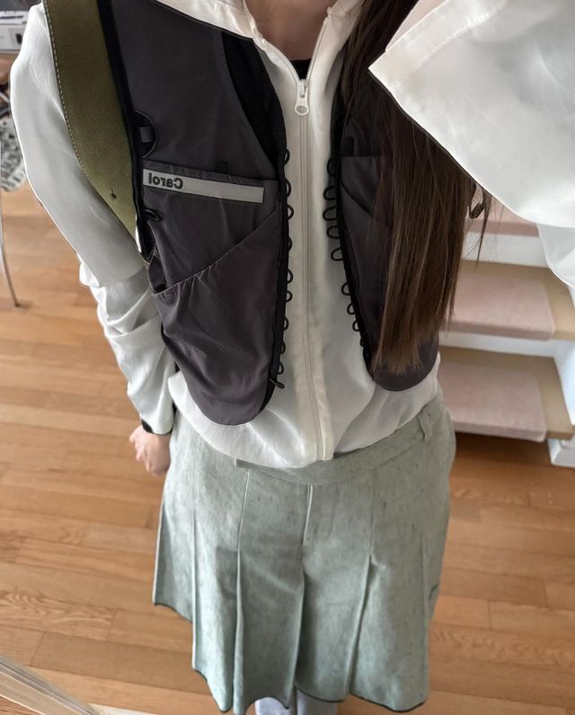 조끼를 입는 데 있어 정해진 문법은 없습니다. 러닝 열풍과 함께 핫 아이템으로 떠오른 러닝 베스트 역시 센스 있는 일상 스타일링을 위한 좋은 선택이 될 수 있죠. 플리츠 스커트 위에 스포티한 러닝 베스트를 매치한 오눅의 룩을 참고해 보세요.