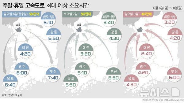 현충일 연휴 이튿날인 7일 토요일은 서울 방향 고속도로의 최대 혼잡이 예상된다.