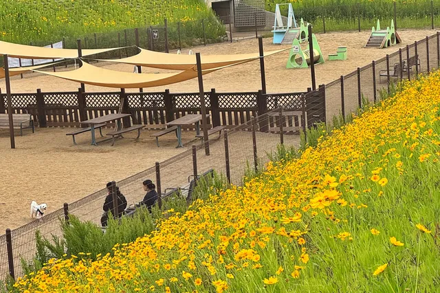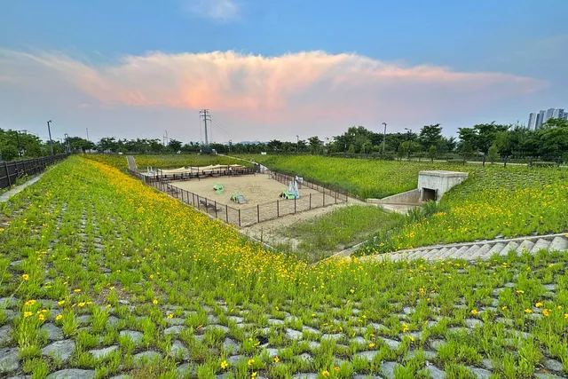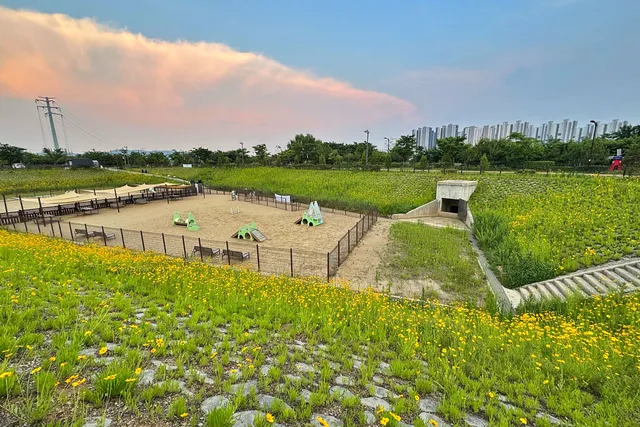 첫 번째 추천 명소는 동삭동 반려견 놀이터 근처입니다. 이곳은 반려견과 함께 산책하기 좋은 장소로 유명하며, 노란 꽃밭이 더해져 사람과 반려동물 모두에게 즐거움을 주는 공간으로 주목받고 있습니다.