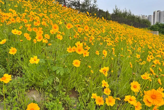 다음으로 추천할 장소는 동삭동 농구장 근처입니다. 이곳은 체육공원과 연결되어 있어 운동과 산책을 좋아하는 사람들의 발길이 끊이지 않는 곳입니다. 최근 큰금계국이 만발하며 주목받고 있습니다.