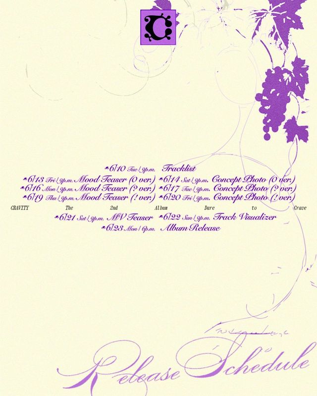 소속사 스타쉽엔터테인먼트는 지난 7일 크래비티 공식 SNS를 통해 두 번째 정규 앨범 ‘데어 투 크레이브(Dare to Crave)’의 스케줄을 공개했다. 프로모션 일정과 함께 앞서 콘셉트 필름과 로고 모션에서도 강조됐던 포도가 일러스트로 다시 등장해 궁금증을 더했다.