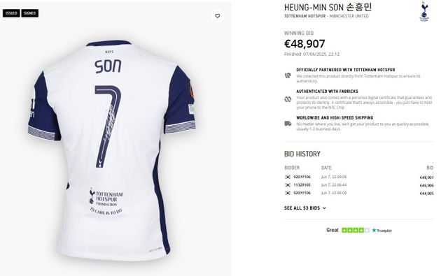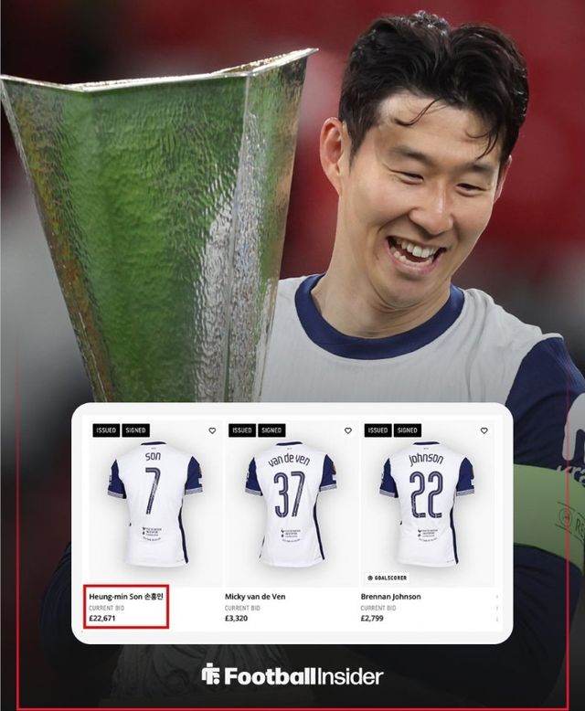 영국 매체 '풋볼 인사이더'는 7일(한국시간) 사회관계망서비스(SNS)를 통해 "팬들은 현재 토트넘의 유로파리그 결승전 승리 당시 착용했던 사인 유니폼에 입찰하고 있다"라고 보도했다.