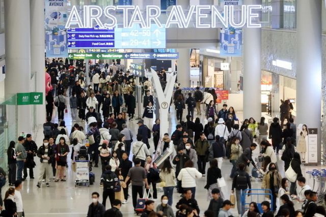 여행객들로 북적이는 인천국제공항 제1여객터미널 출국장 내 면세점 구역. © 연합뉴스