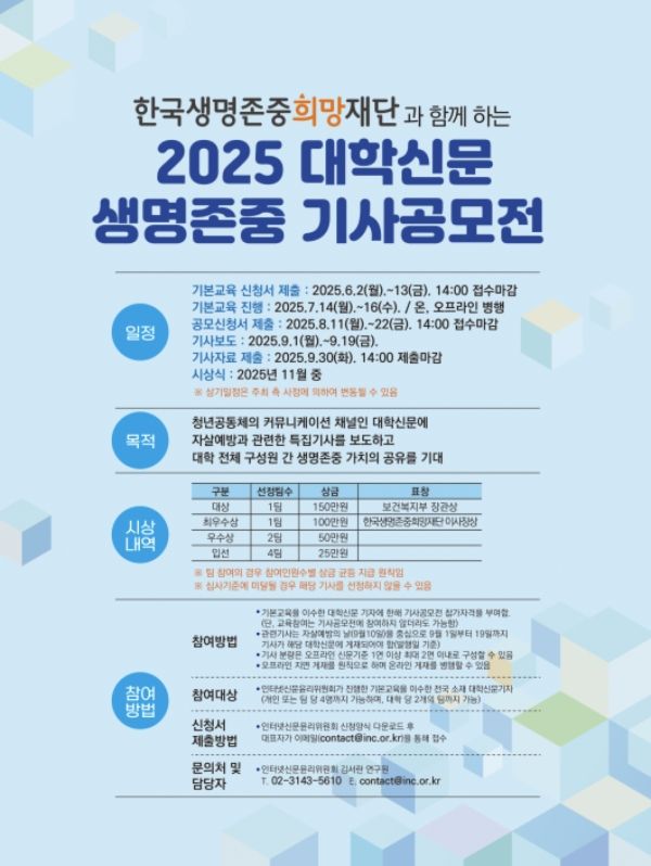인터넷신문윤리위원회(위원장 이재진, 이하 인신윤위)가 오는 7월부터 대학신문 기자 및 예비 언론인을 대상으로 ‘2025 대학신문 생명존중 저널리즘 스쿨’을 운영한다. 모든 교육은 무료로 진행되며, 오는 13일 오후 2시까지 신청받는다.