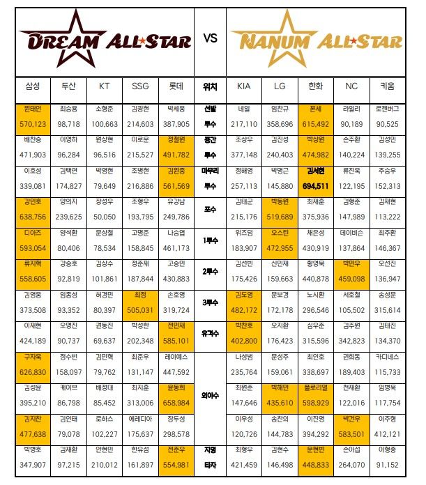 9일 KBO가 발표한 올스타 팬 투표 1차 중간 집계. 사진=KBO