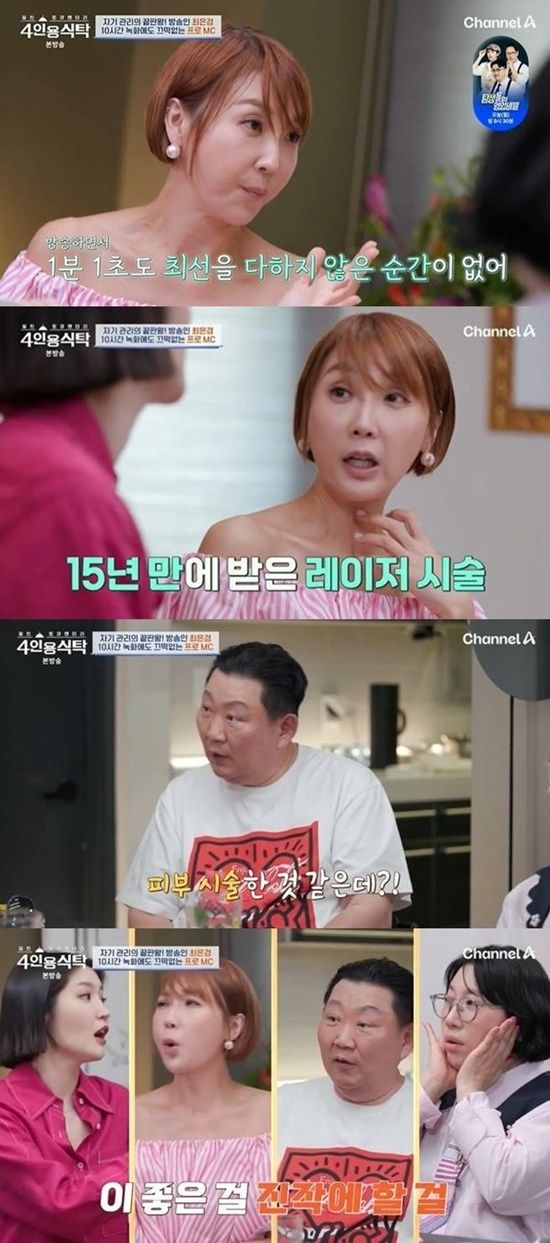 9일 방송된 채널A '절친 토큐멘터리-4인용식탁'에는 최은경이 출연해 절친 개그우먼 김영희, 방송인 김새롬, 한의사 이경제를 초대해 다양한 이야기를 나눴다.