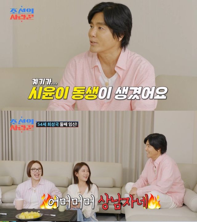 이에 '사랑꾼' MC들이 계기를 궁금해하자, 그는 아내의 둘째 임신을 깜짝 발표했다. 24세 연하 아내와 결혼한 최성국은 지난 2023년 가을 첫 아들 최시윤을 얻었다. 최성국의 둘째 소식에 황보라는 "자연 임신이냐, 오빠 나이에 어떻게 그렇게 금방 되냐"며 최성국의 정확한 나이를 검색해 웃음을 자아냈다. 또 황보라는 "상남자다. 우리도 희망이 있다"며 너스레를 떨었다.