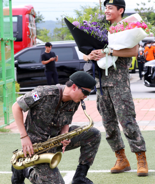 작년 6월 팀의 맏형 진의 전역 당시 색소폰을 불며 그의 제대를 성대하게 축하했던 RM은 이날도 색소폰을 불며 뷔와 자신의 전역을 자축했다.