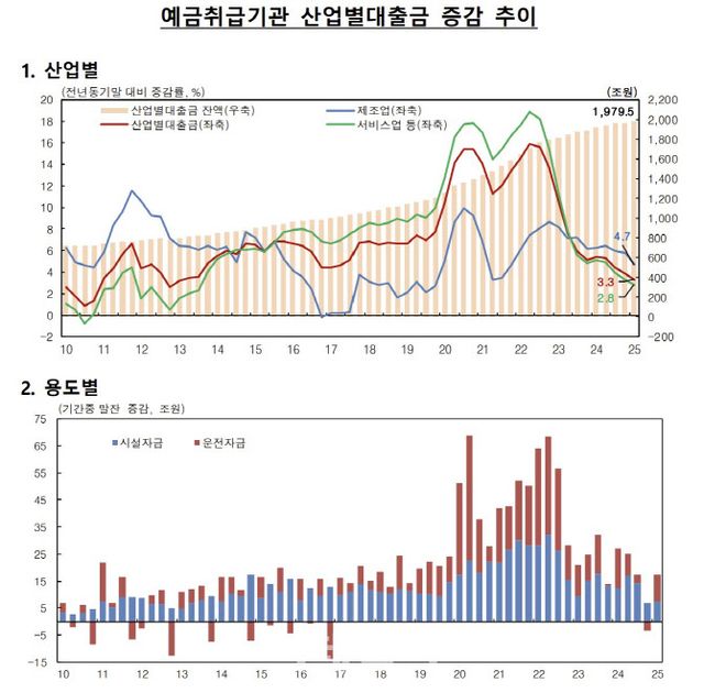 산업별로 보면 제조업 대출이 8조원 증가하며 전분기(-1조 6000억원) 대비 증가 전환했다. 기업들이 연말 부채 비율 관리를 위해 일시적으로 상환했던 대출을 다시 낸 영향으로, 운전자금을 중심으로 대출이 늘었다.