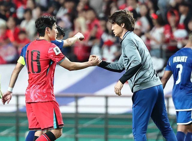 지난 10일 오후 서울 마포구 상암동 서울월드컵경기장에서 열린 2026 국제축구연맹(FIFA) 북중미 월드컵 아시아 3차 예선 B조 10차전 대한민국과 쿠웨이트의 경기, 홍명보 감독이 4대0 승리 후 이강인을 격려하고 있다 / 뉴스1