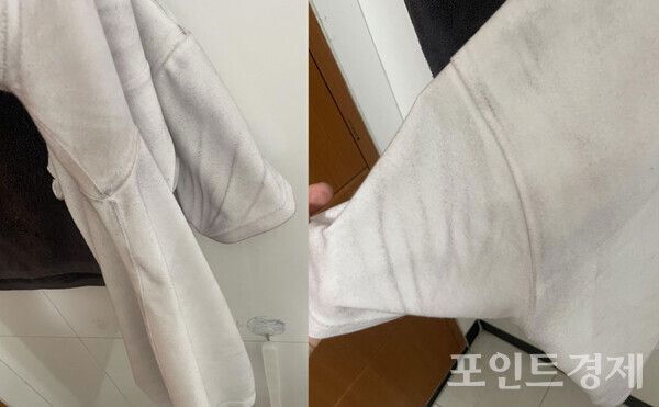하지만 본사가 A씨의 제보를 취재한 내용에 따르면 이날 오전 출근하면서부터 잠깐 입었던 재킷은 안에 입은 밝은 색 티를 까맣게 이염시킨 것을 확인할 수 있었다.