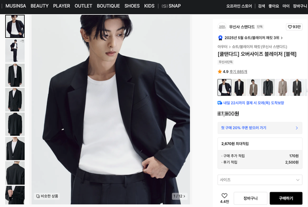 무신사 온라인몰 '쿨탠다드 오버사이즈 블레이저' 제품 화면 갈무리