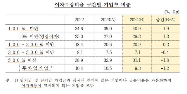 이자보상비율은 기업이 이익에서 얼마를 이자비용으로 사용하는지를 나타내는 수치로, 100% 미만이면 벌어들인 돈으로 금융비용을 감당하지 못한다는 뜻이다. 특히 전체의 28.3%에 이르는 기업이 영업 적자를 기록하며 0% 미만의 이자보상비율을 나타냈다.