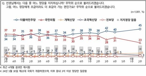 뉴시스 보도에 따르면, 여론조사 회사 엠브레인퍼블릭·케이스탯리서치·코리아리서치·한국리서치가 지난 9~11일(6월2주차) 전국 만 18세 이상 남녀 1001명을 대상으로 실시한 전국지표조사(NBS)에서 민주당의 지지도는 45%, 국민의힘은 23%로 집계돼 22%포인트 차이를 보였다.