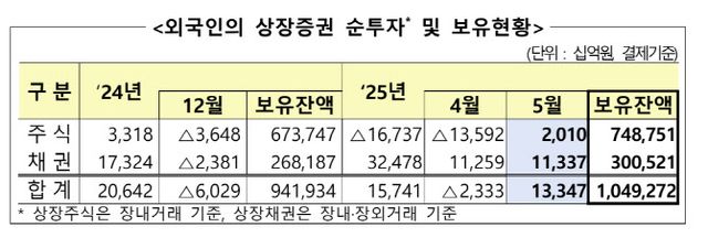 12일 금융감독원에 따르면 5월 중 주식 부문에서 외국인은 상장주식 2조100억원을 순매수했고, 이 가운데 유가증권시장에서 1조8670억원, 코스닥시장에서 1430억원을 각각 순매수했다.