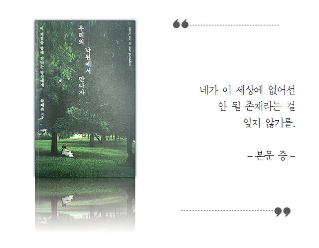 저자는 '언제가 우리만의 낙원에서 만나자'고 외친다. 그는 "낙원은 가장 오래 아팠던 곳에서 슬픔을 흉내 내지 않고 살아 낸 터전에서 피어나는 법"이라며 "그러니 한 번만이라도 화사하고 싶었던 마음으로 우리의 낙원에서 만나자"고 했다. 그러면서 "함께라는 건 어떤 형태로든 믿을 구석이 된다"며 "나의 삶을 다 아는 사람이 해주는 이야기와 격려를 이 책에 담고 싶었다"고 전했다. 북로망스. 1만9500원. 박소정기자