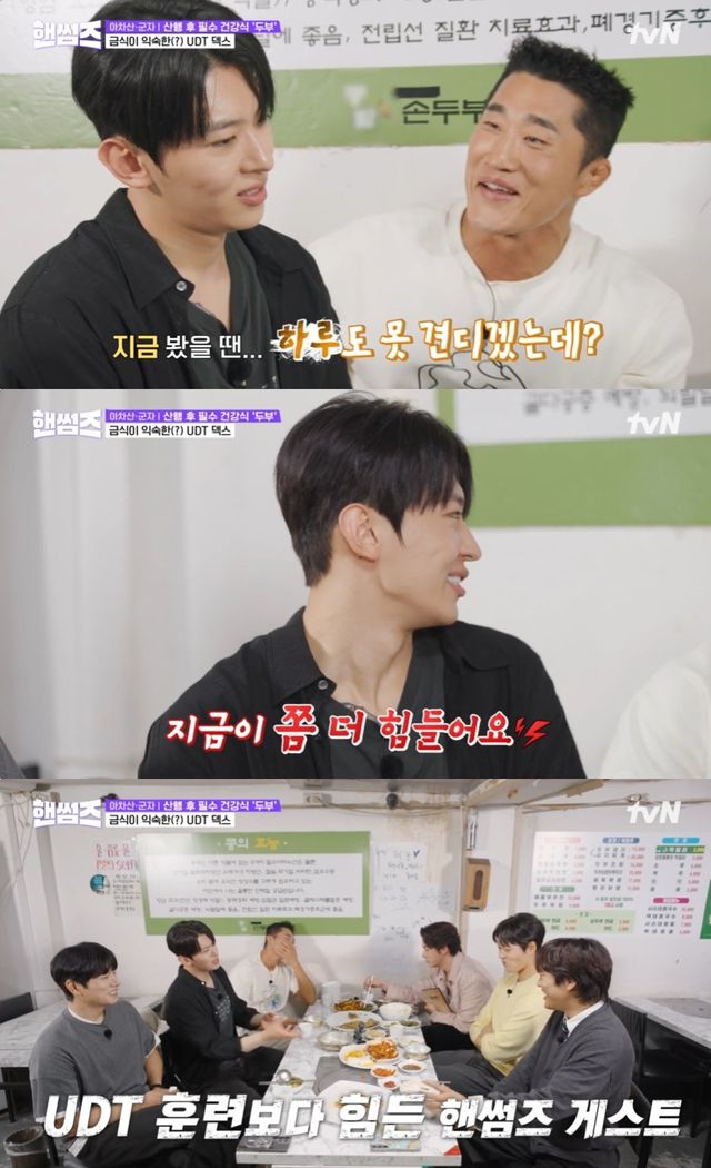 "UDT 때가 힘드냐 지금이 힘드냐"는 물음에 덱스는 "지금이 더 힘들다"고 망설임 없이 답해 폭소를 자아냈다.