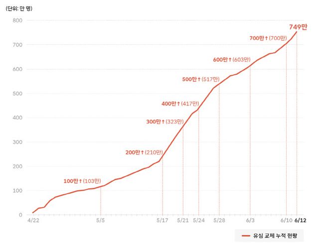 SK텔레콤은 13일 뉴스룸을 통해 전일 기준 유심 교체 고객이 당일 27만 명, 누적 749만 명으로 집계됐다고 밝혔다. 잔여 예약 고객 수는 225만 명으로 교체율은 76.9%다.