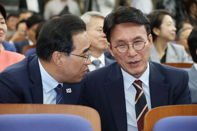 김민석(오른쪽) 국무총리 후보자가 13일 오후 서울 여의도 국회에서 열린 더불어민주당 제2기 원내대표 선출 의원총회에 참석해 박홍근 의원과 대화하고 있다. / 뉴스1