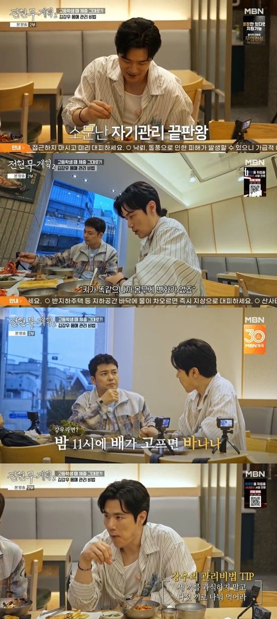 전현무는 '자기관리의 끝판왕'으로 불리는 김강우에게 "고등학교 때 몸무게를 유지하고 있다고 들었는데, 어떻게 그럴 수 있냐"고 물었다.