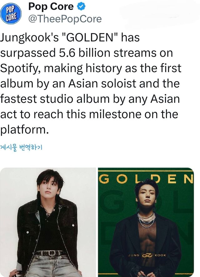 BTS 정국이 ‘금손’이라는 수식어를 다시 한 번 증명했다. 첫 솔로 앨범 ‘GOLDEN’이 세계 최대 음원 스트리밍 플랫폼 스포티파이에서 누적 56억 스트리밍을 돌파하며 K팝 솔로 아티스트 사상 유례없는 기록을 만들어냈다.