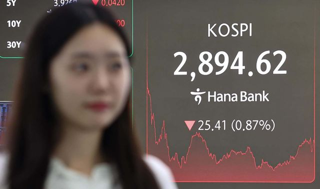 13일 오후 서울 중구 하나은행 본점 딜링룸 전광판에 종가가 표시되고 있다. 이날 코스피 지수는 전 거래일 대비 25.41p(0.87%) 하락한 2894.62, 코스닥 지수는 20.59p(2.61%) 하락한 768.86으로 장을 마감했다. 원·달러 환율은 전 거래일 주간거래 종가보다 10.9원 오른 1369.6원에 주간 거래를 마감했다. / 뉴스1