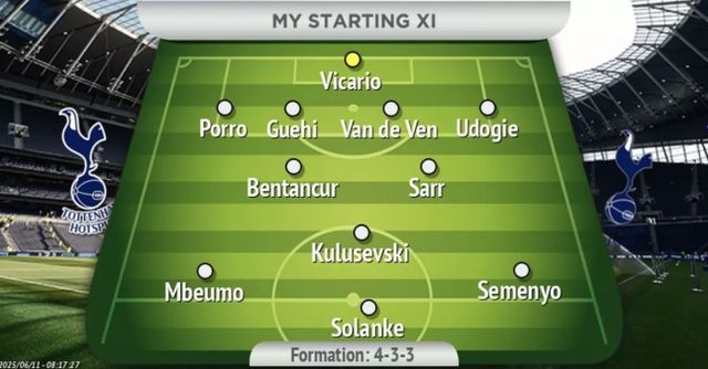 매체는 4-3-3 전략을 기반으로 예측했다. 먼저 굴리엘모 비카리오가 골문을 지켰다. 페드로 포로, 마크 게히, 미키 판 더 펜, 데스티니 우도기가 수비진을 구성했다. 모르텐 히울만, 루카스 베리발, 에체베리 에제가 중원으로 나섰다. 그리고 음뵈모,  도미니크 솔란케, 손흥민이 공격진을 구성할 것으로 바라봤다.