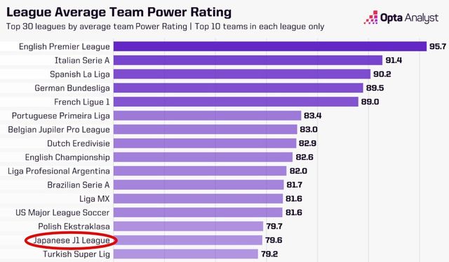 리그 내 상위 10위 팀 평균 점수를 기반으로 한 파워랭킹에서도 J1리그는 15위에 들며 세계적으로도 경쟁력 있는 리그라는 걸 입증했다. 이 기준에서는 사우디 리그가 18위에 올라 순위를 크게 끌어올렸다.