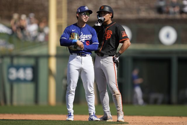 Los Angeles Dodgers shortstop Hyeseong Kim, left, and San Francisco Giants Jung Hoo Lee chat near second base during a pitching change in the third inning of a spring training baseball game, Saturday, March 1, 2025, in Phoenix. (AP Photo/Ashley Landis)/2025-03-02 08:40:31/ <저작권자 ⓒ 1980-2025 ㈜연합뉴스. 무단 전재 재배포 금지, ai 학습 및 활용 금지>